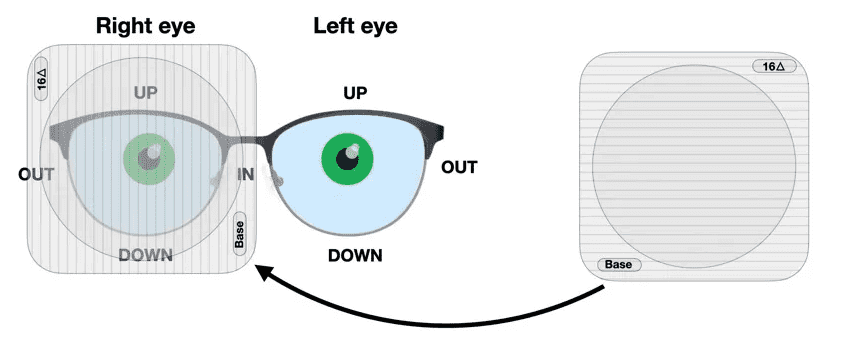 เมื่อแสงเดินทางผ่านฐานปริซึม แสงจะหักเหไปทางฐาน (Base) ทำให้ภาพที่คนไข้มองเห็นเคลื่อนไปทางยอด (Apex)